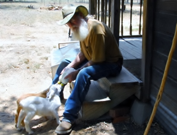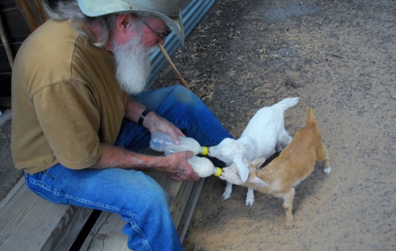 Now the fun really began. I’ve got two hungry babies that had been on their mom for 4 days or so and they don’t want anything to do with that bottle. I mean, it was a real fight the four times a day we were trying to get some formula down them. Plus we were getting all sorts of conflicting advice by numerous goat “experts” such as they won’t ever take a bottle after being with their mother that long , don’t use the formula—use a concoction of condensed milk, whole milk and butter milk instead (that proved to be real popular—not) , to just persevere and they’ll finally come around. Well, that’s what we did, and after about 4 days of battle, one morning one of the kids took to the bottle like it was the most natural thing in the world, and by that evening, the other one had too. What a blessing that was.